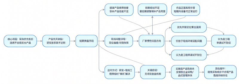 更關鍵的是,當設備出現定位偏差等問題時,設備廠家的第一反應往往是懷疑定位算法,習慣性依靠研發與現場工程師的經驗去“填坑”。這種就事論事的解決思路,導致實施層面暴露的產品隱患,很難通過項目復盤反思,反饋到企業的整體采購管理與品控體系中,最終形成 “治標不治本” 的惡性循環。